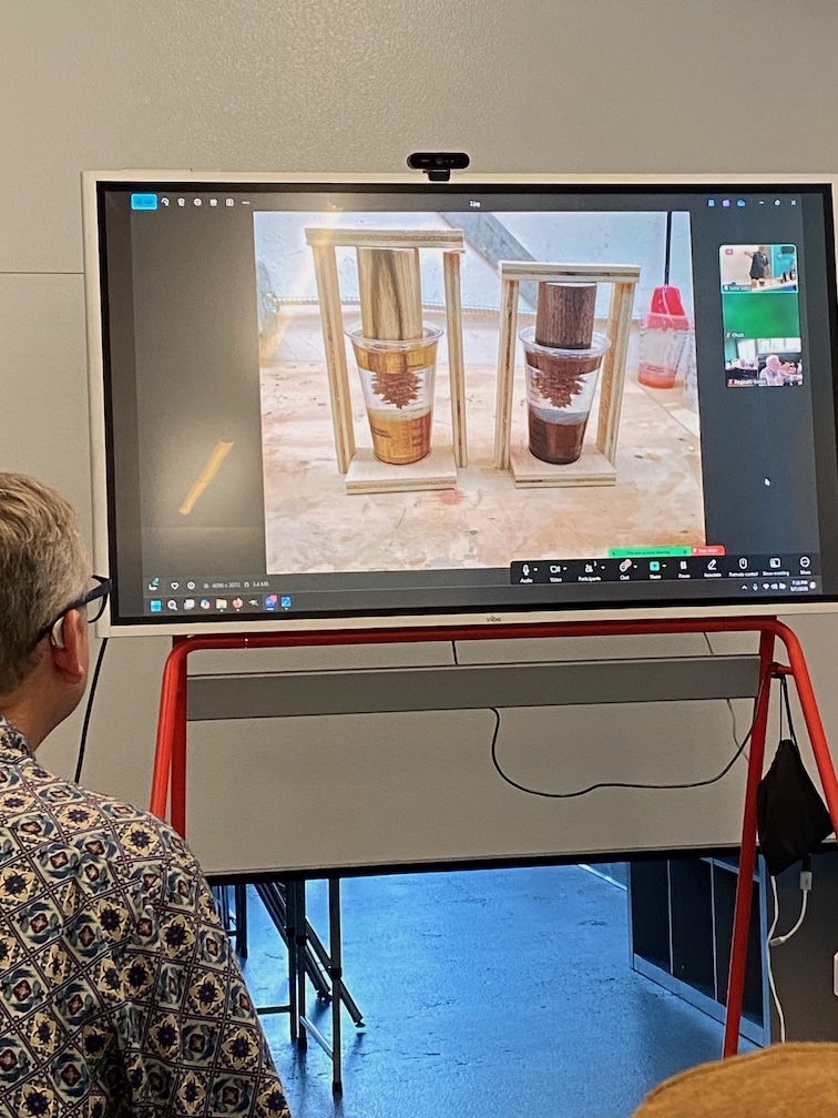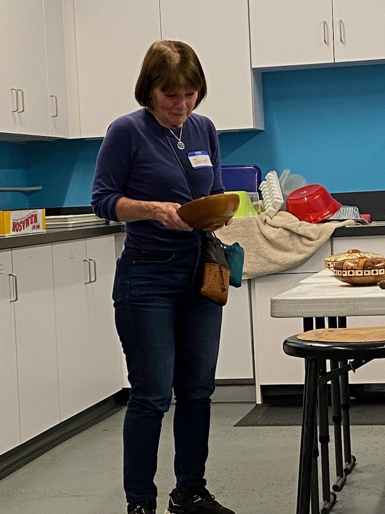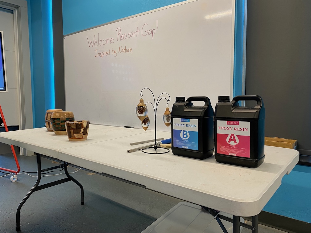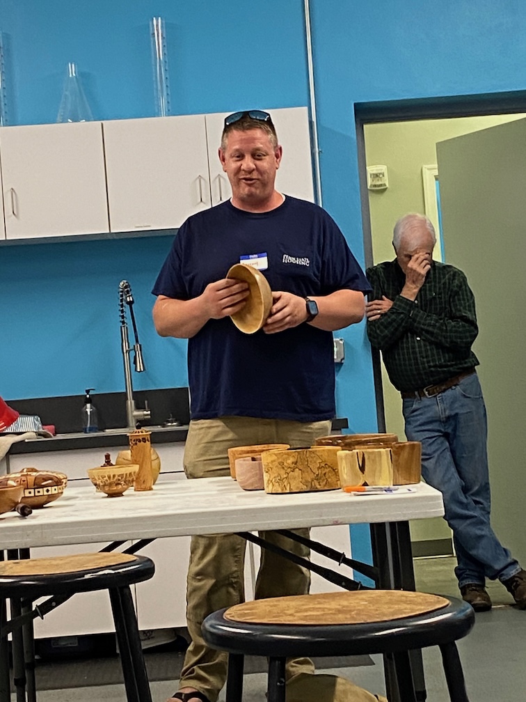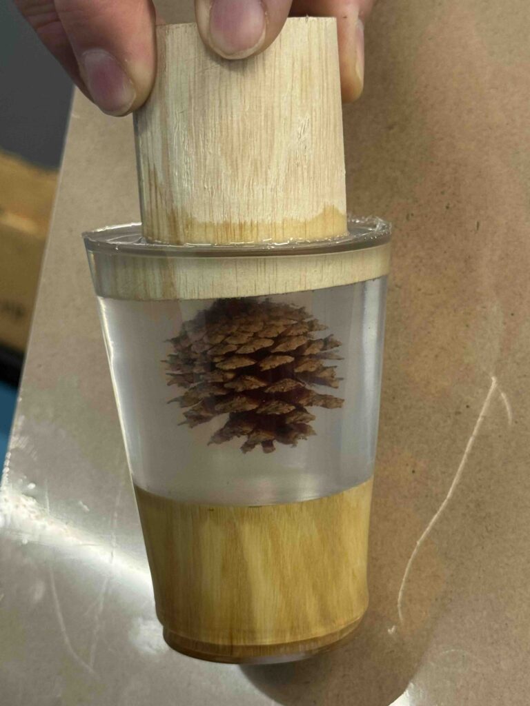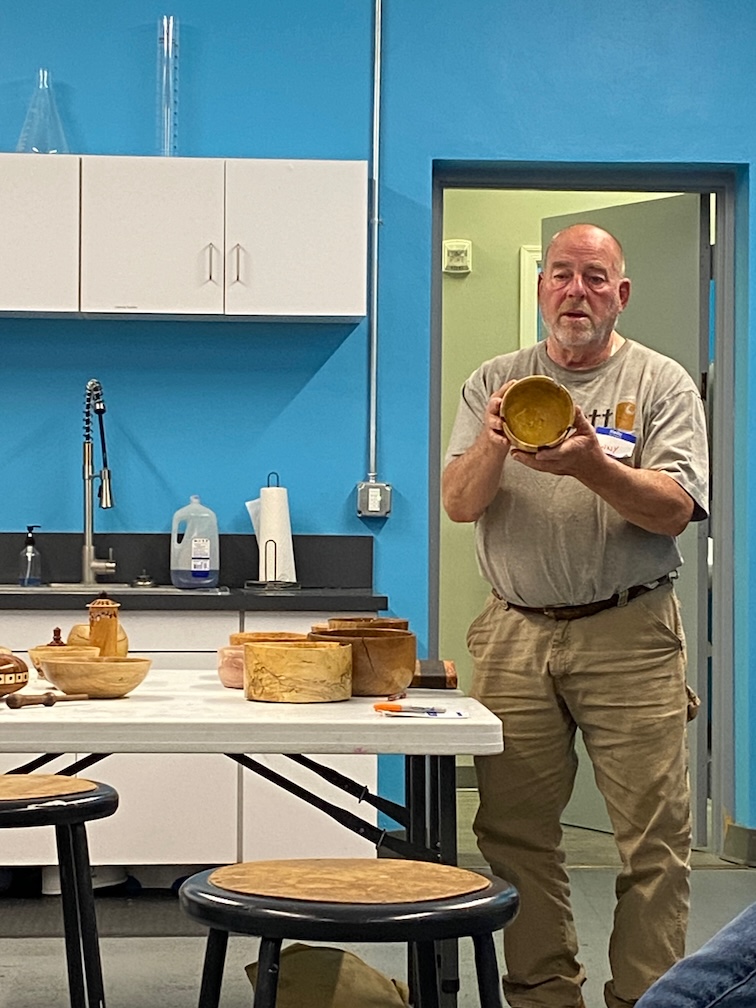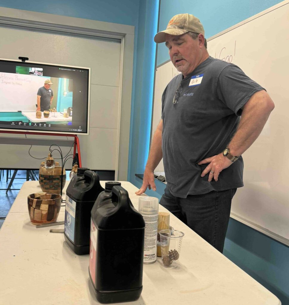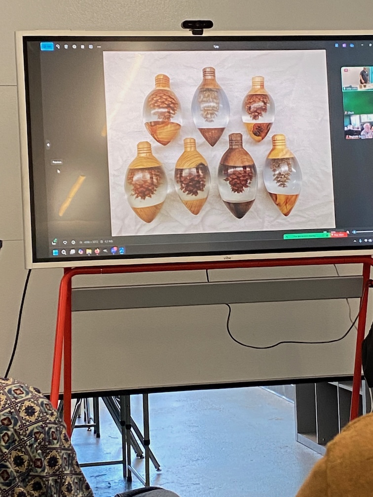 Gib Corl presented how he made Christmas ornament “bulbs” using pine cones and epoxy.