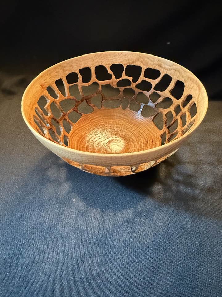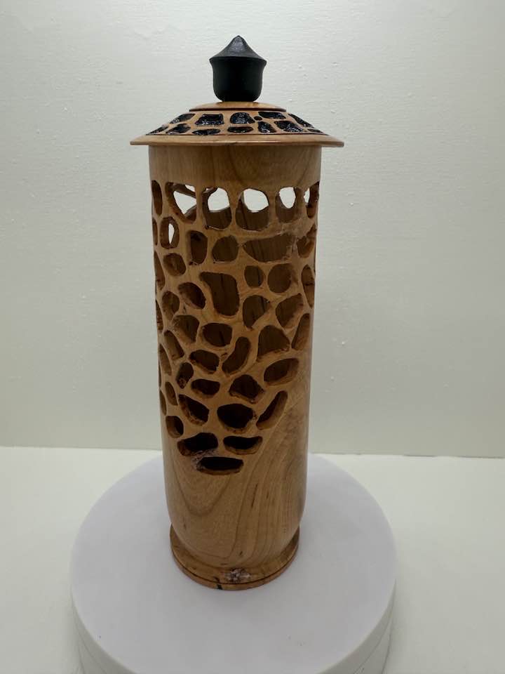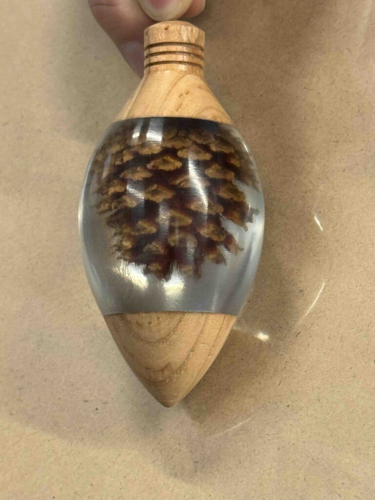 He showed an ornament with a small hemlock cone, but other center pieces can be used. The cone is hot glued to a blank and another blank is hot glued to the bottom of a plastic cup. The cone is suspended over the cup with a jig he has fabricated and after all the parts are in alignment, he pours the epoxy mix into the cup. He uses a 5 gallon pressure pot @ 60psi to compress any bubbles in the pour and waits about 48 hrs before removing the item. The cured assembly is then put in the lathe and turned to the desired shape, lacquered, and sanded up to 400 grit.