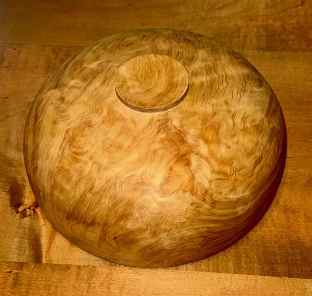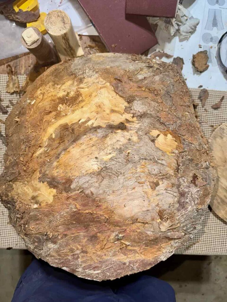 White Cedar Burl”. Below you can see the log with the Burl which was cut from the log and cut in 2 pieces, one of which, Richard prepped for the lathe and turned into a large bowl with great grain. One challenge was dealing with tear-out due to the grain and softness of the cedar. Nice bowl.